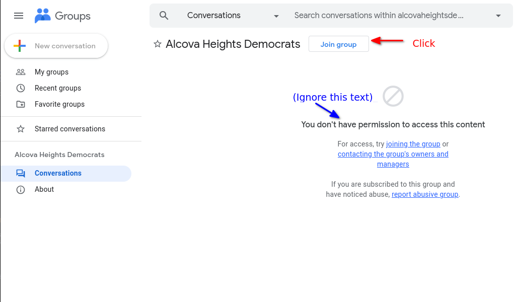4. Look for the button that says “Join Group”. Ignore the text that says “You don’t have permission to access this content.” It just means you haven’t yet joined.