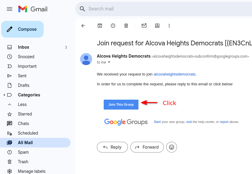 3. You will receive an email confirming your request. Check your spam folder if you don’t see it. Click on the blue “Join This Group” button and it will open a web page.